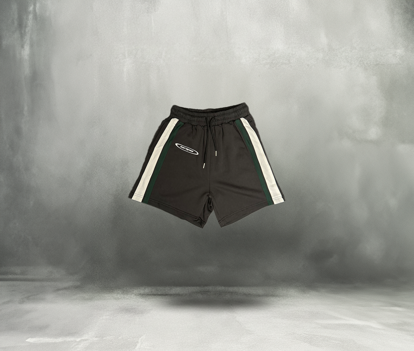 These shorts are designed in a regular fit using heavyweight dark grey cotton, ensuring both comfort and durability. They feature two striking seams in Forest Green and Egg White, adding a pop of color to the design. The shorts proudly display our new track logo on the thigh for a modern touch.
