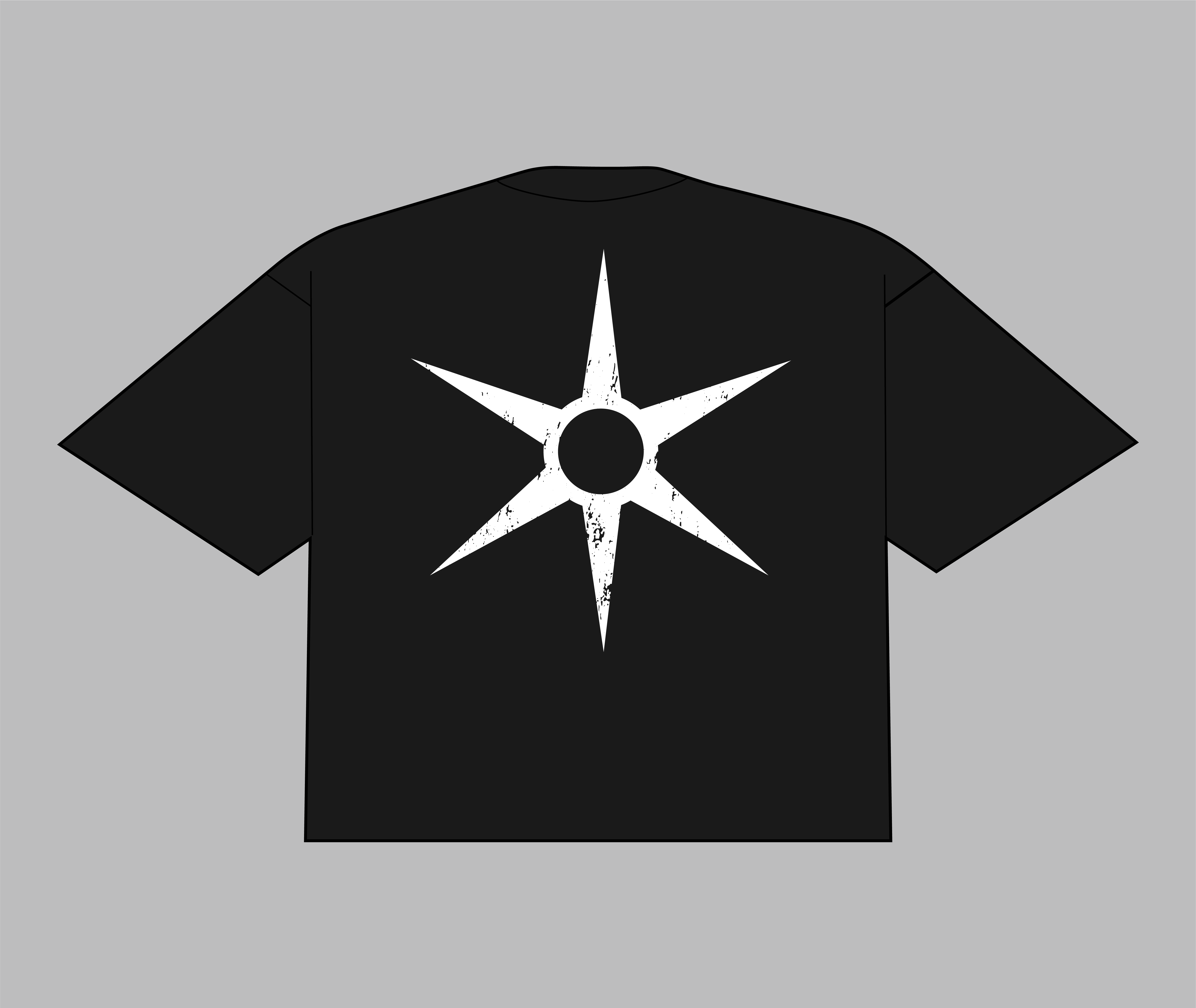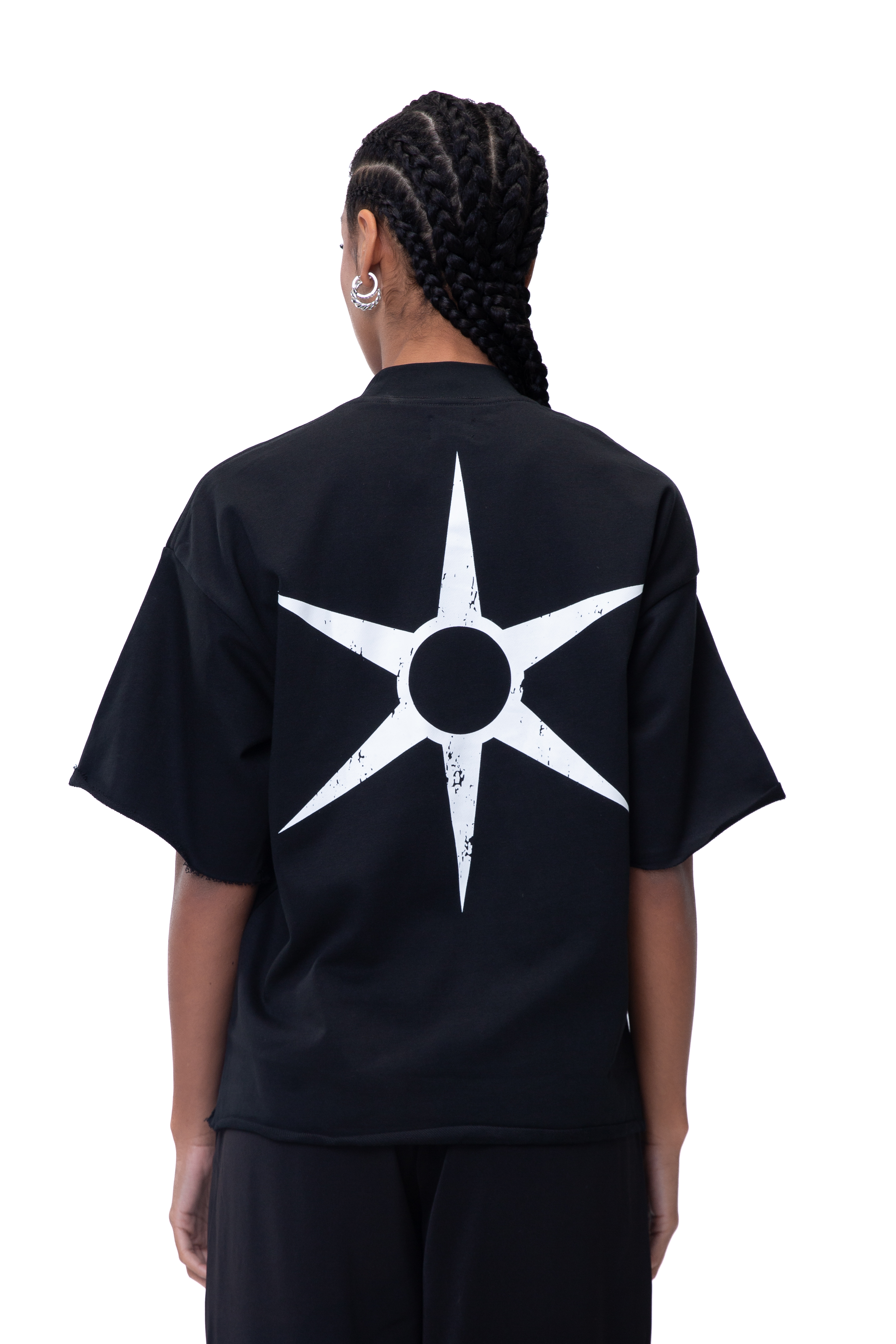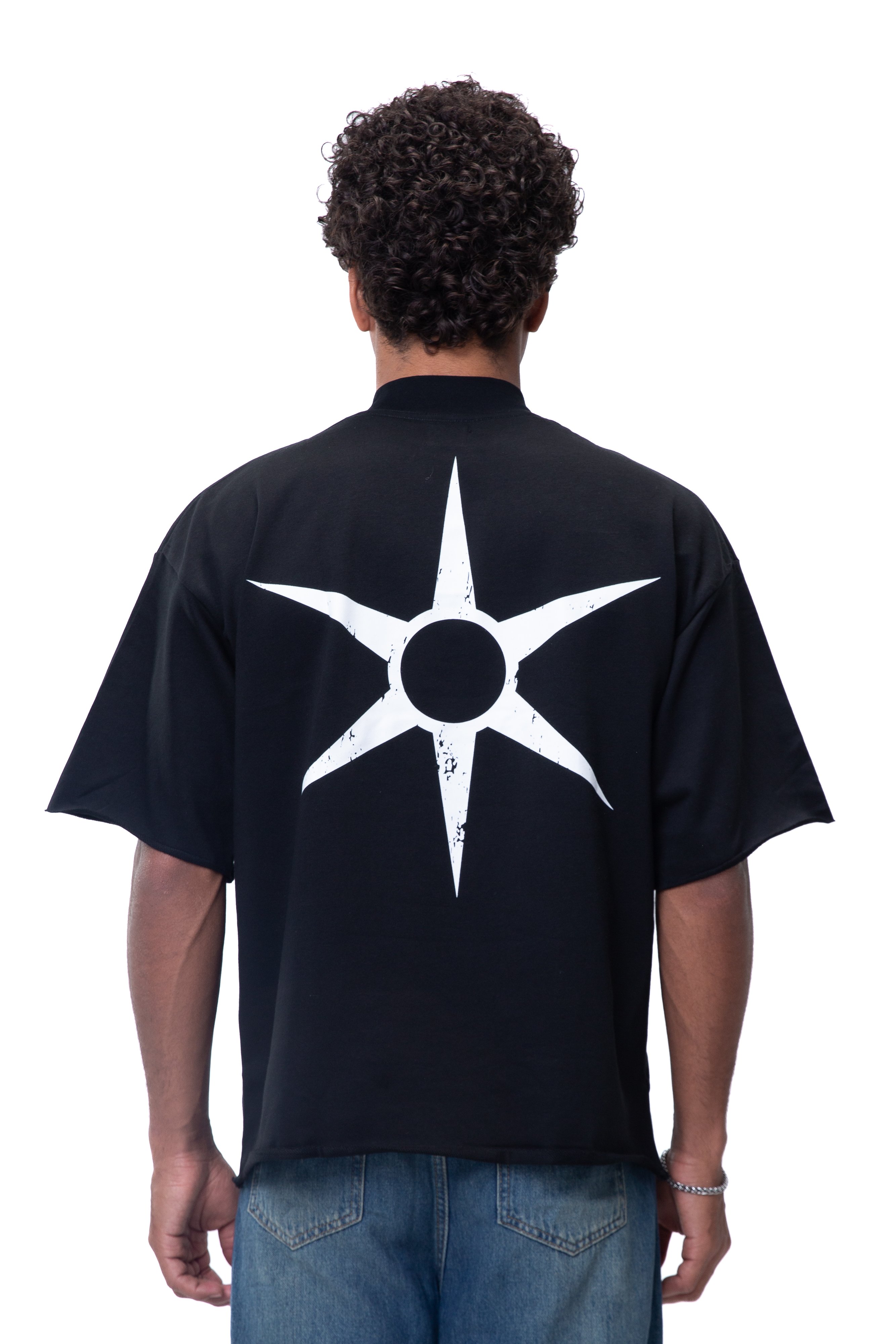 Designed in classic black, this short sleeve t-shirt is complemented by our distinctive mock neck collar. The piece is highlighted by our heavy metal logo in the front and a grungy star in the back.