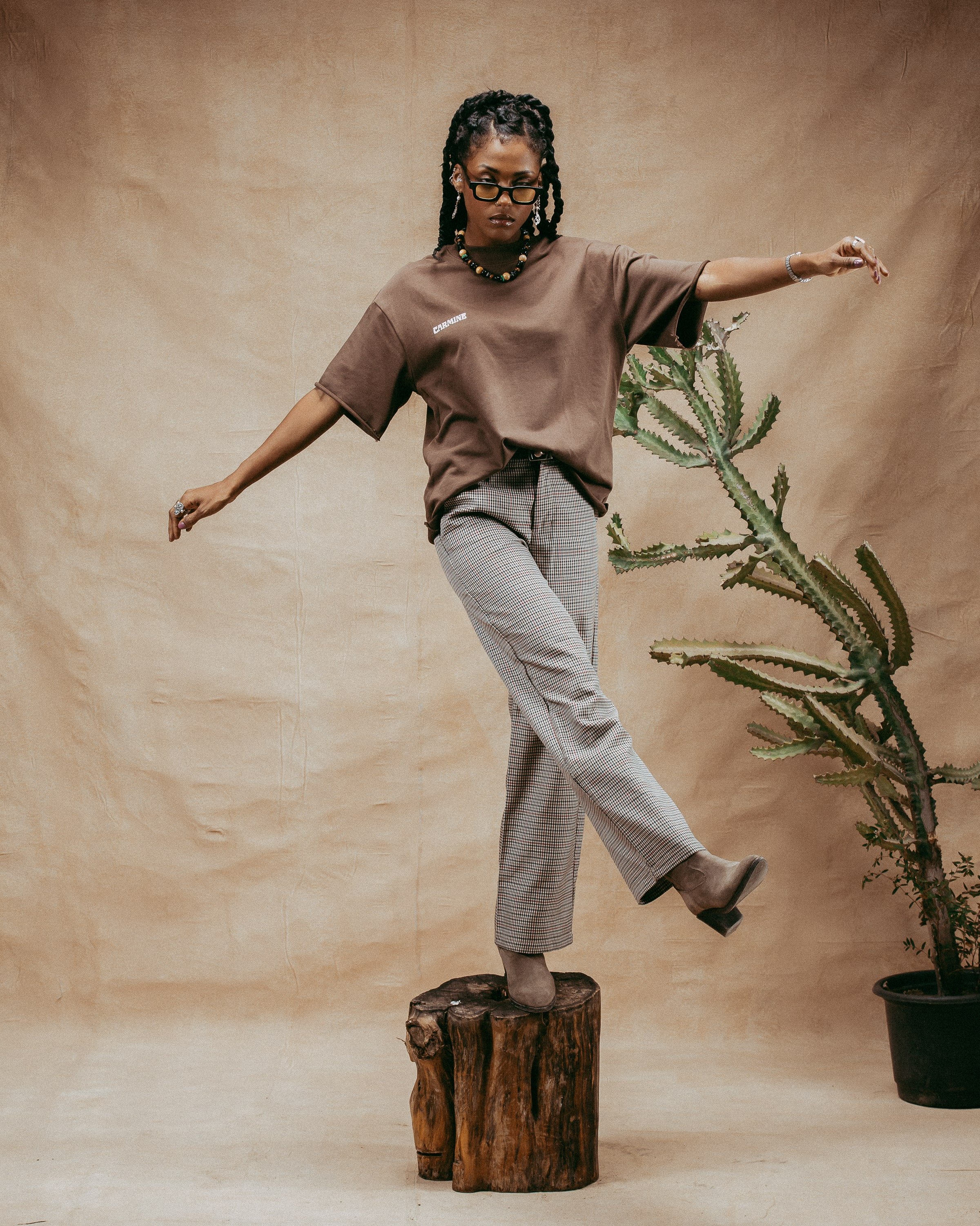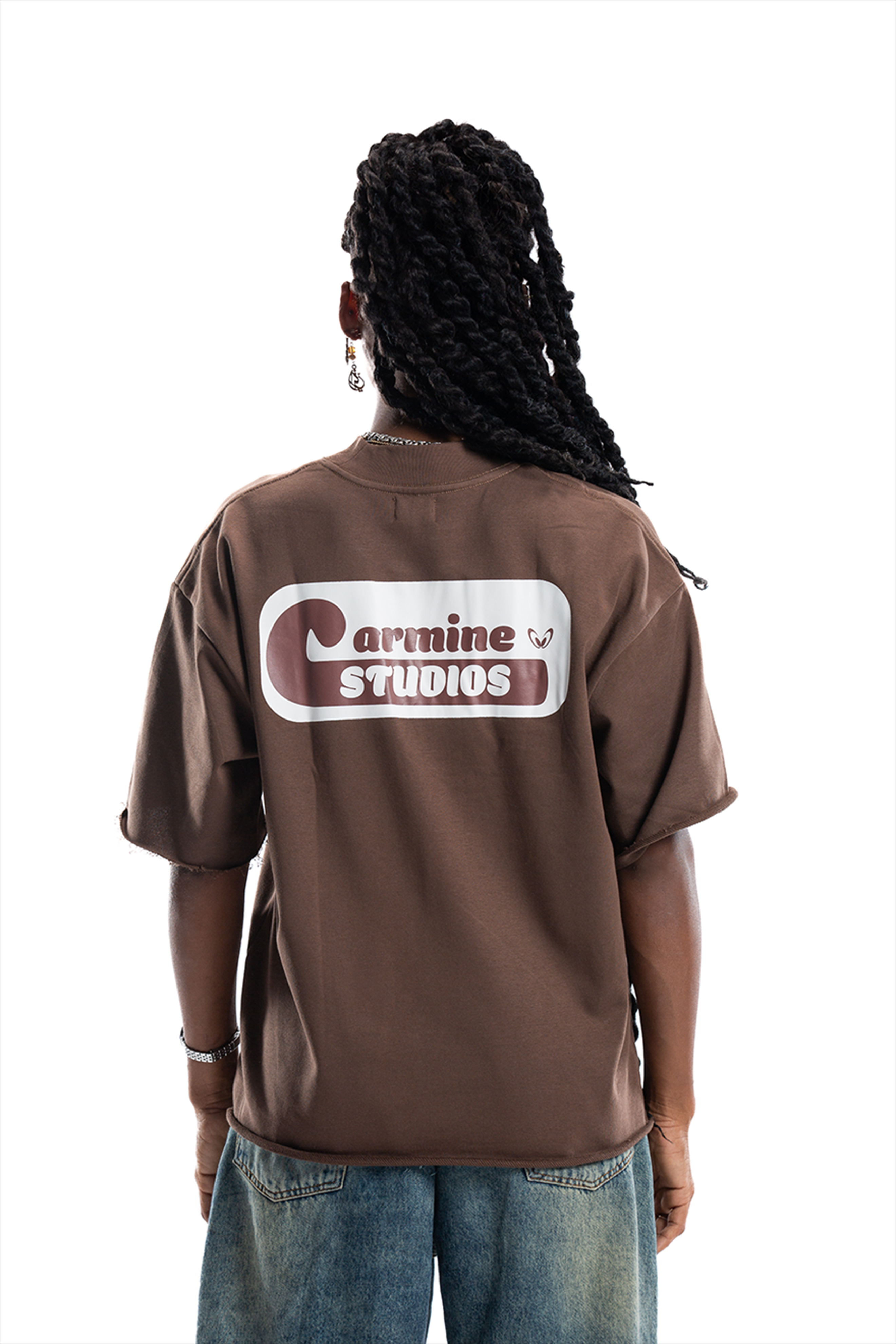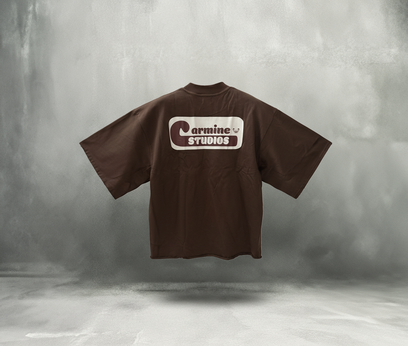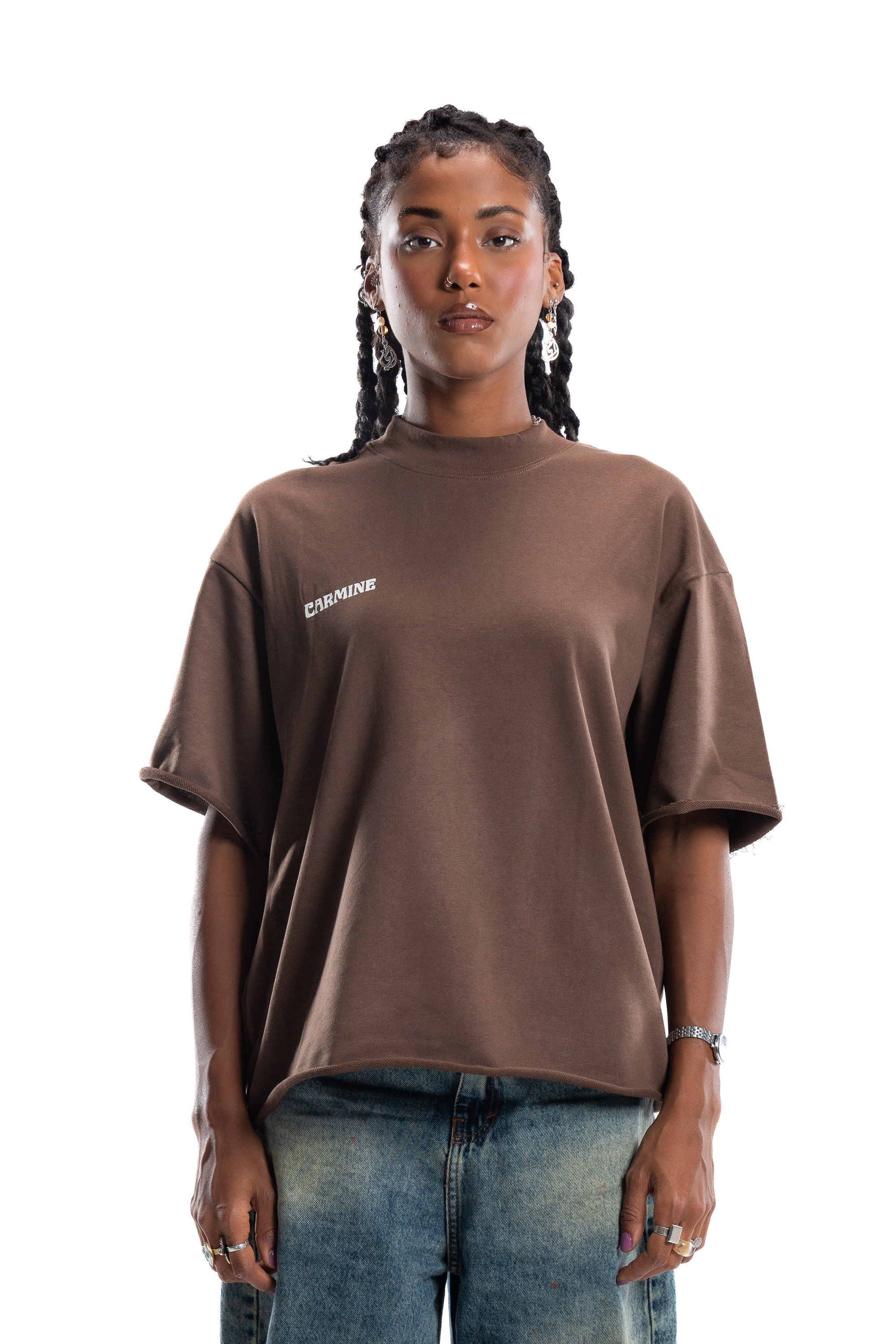 This short sleeve design comes in a rich Chocolate Brown and is accented with a ribbed mock neck collar for a distinctive look. The shirt showcases a Carmine logo on the chest and a striking Carmine Studios graphic on the back.